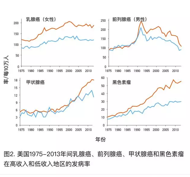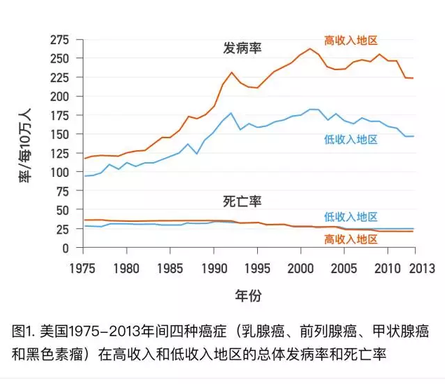 尽管高收入地区和低收入地区的发病率差异很大,但死亡率却十分接近,这表明两类地区的潜在疾病负担大概是一致的,从而提示高收入地区的较高癌症发病率是由于癌症的过度诊断。作者推断产生癌症过度诊断的最可能原因为:高收入人群接受了过多的、非必要的医学检查。