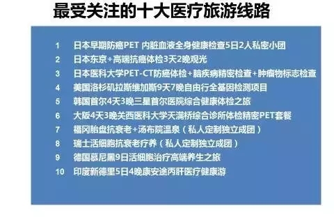报告从产品的浏览、预订排名,发布了网上人气最高的十大医疗旅游线路,包括日本东京抗癌体检、美国洛杉矶拉斯维加斯全基因检测自由行、韩国首尔综合健康体检之旅、瑞士抗衰老疗养等。