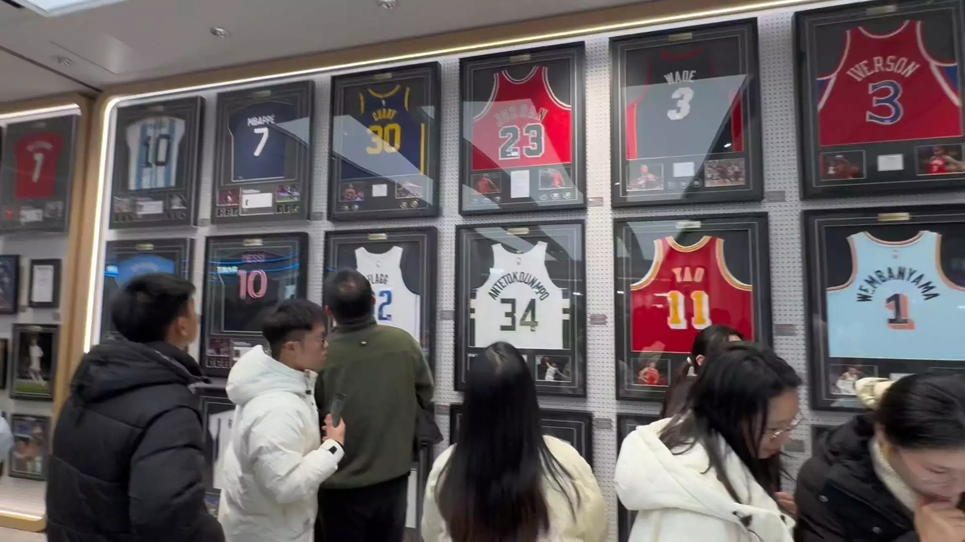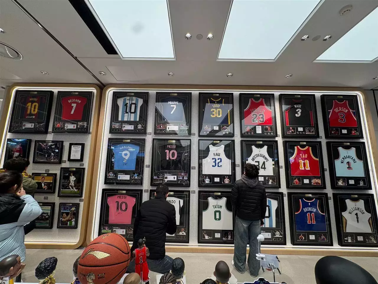 新乡市民郑先生向记者表示,该专柜一面墙都是球星的签名球衣,比如梅西2022年世界杯阿根廷国家队10号球衣、姆巴佩2022-23赛季大巴黎主场7号球衣、贝克汉姆1999年曼联欧冠主场7号球衣等等。其中最贵的当属乔丹97-98赛季公牛23号签名球衣,售价138000元,售价最低的是艾佛森1996-97赛季76人3号签名球衣,价格为6300元。